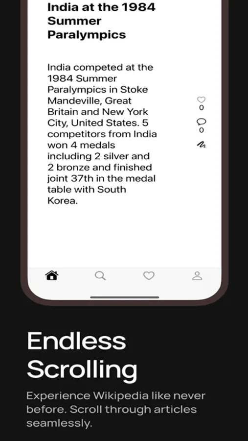 With WikiTok’s infinite scroll, you’ll experience Wikipedia like never before. Each time you scroll, new content loads instantly — no breaks, no barriers, no friction. It’s a smooth reading experience that keeps you engaged as you uncover one fascinating topic after another.
