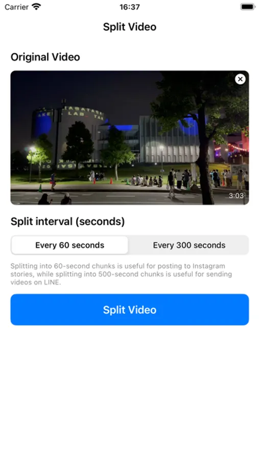 • Custom Split Intervals: Choose from preset intervals (e.g., 60 or 300 seconds) or set your own.