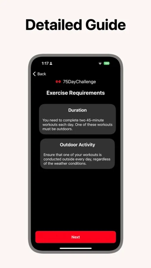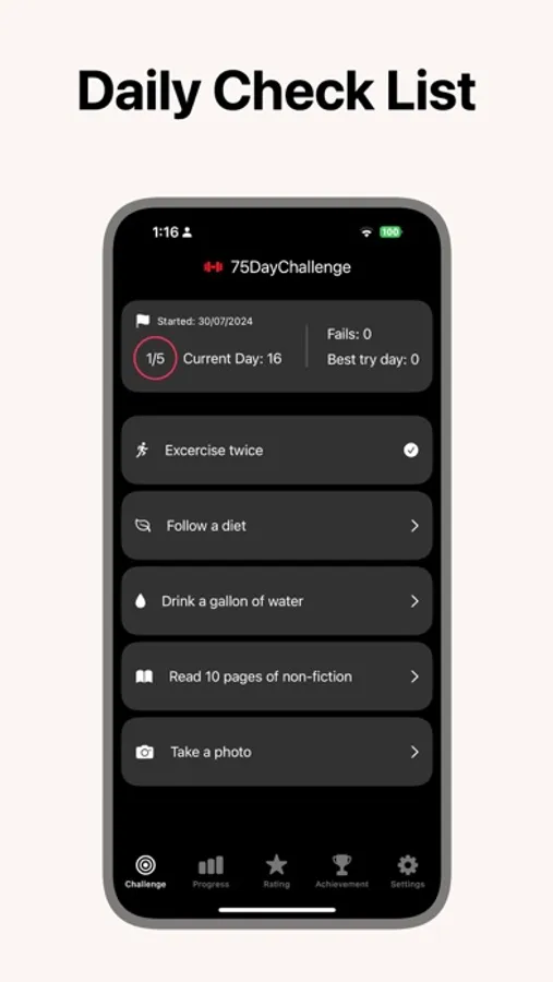 Welcome to 75 Days - Transform Challenge, the ultimate self-improvement app designed to guide you through a transformative 75-day journey. This program is meticulously crafted to help you build mental toughness, enhance discipline, and achieve lasting personal growth. Through a structured regimen, you will push your limits and unlock your full potential. Are you ready to take on the challenge and transform your life?