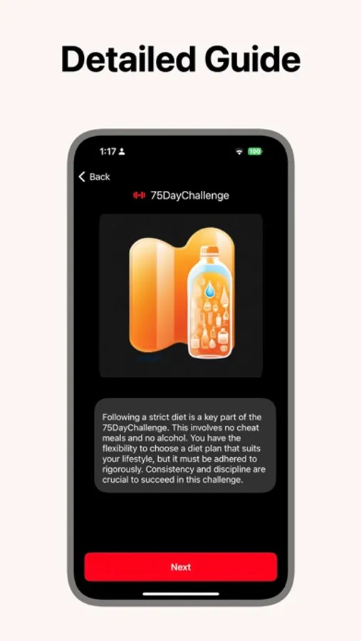 Hydration is key to maintaining optimal health and performance. As part of the 75 Days - Transform Challenge, you will be required to drink a gallon of water every day. Staying hydrated supports digestion, enhances cognitive function, and improves your overall well-being. The app will help you track your daily water intake, ensuring you meet this essential requirement.