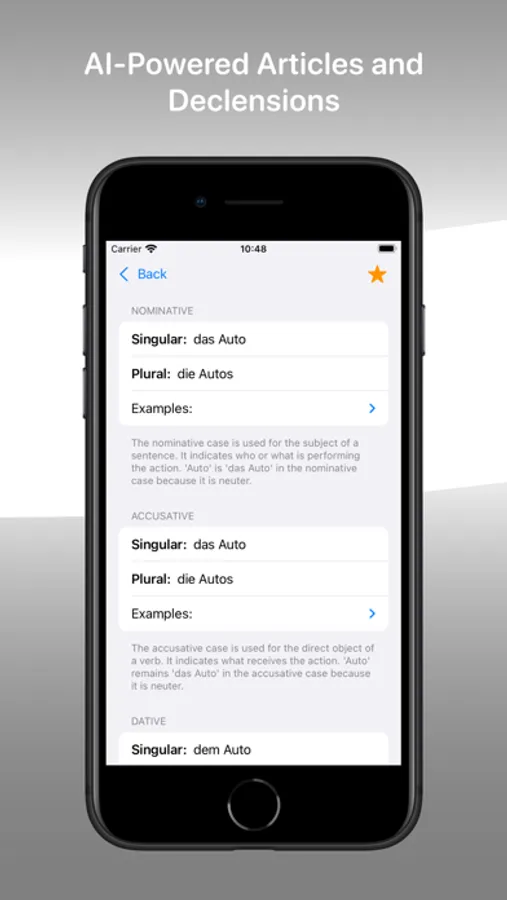 This app makes it easier to learn the articles (der, die, das) of German nouns. Thanks to AI, example sentences are automatically generated for each word.