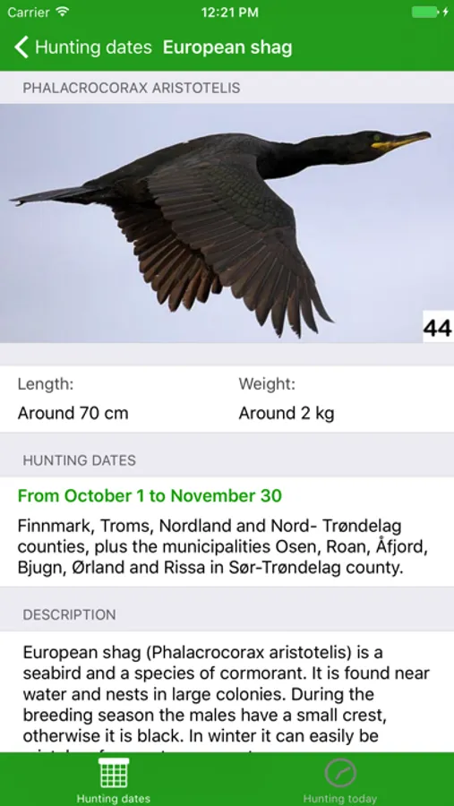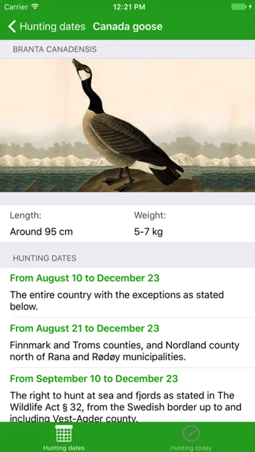 The app provides the hunting dates for wildlife in Norway, as well as which species can be hunted today and information about the species. The dates are valid up to and including March 31st 2022.