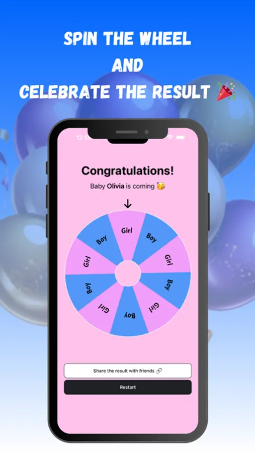 After the wheel stops, it shows the gender of your baby that you just selected with a congratulation message. Now you can celebrate this big news for your family!