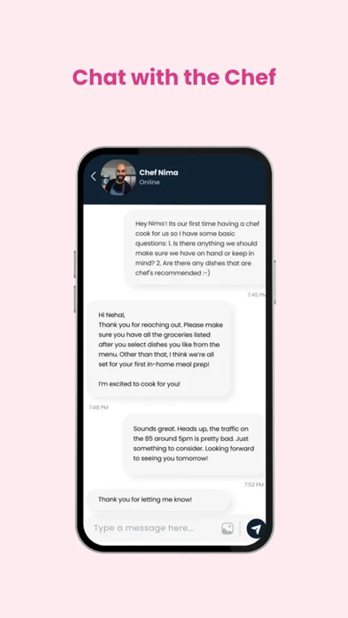 Select dishes, personalize recipes, chat directly with your chef, and receive a grocery list curated just for your visit.