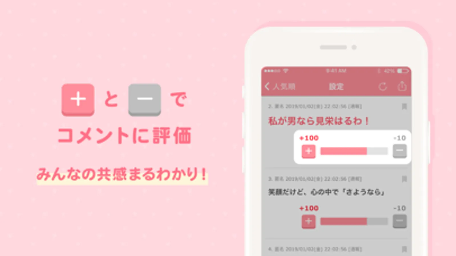 共感できるコメントがあったら「+」「−」ボタンで投票!「+」「−」の数を見れば、どのコメントが支持されているのか一目で分かるよ。ニュースを見てみんなどう思っているの?どの意見が多数派?などなど、みんなの意見がすぐわかる!