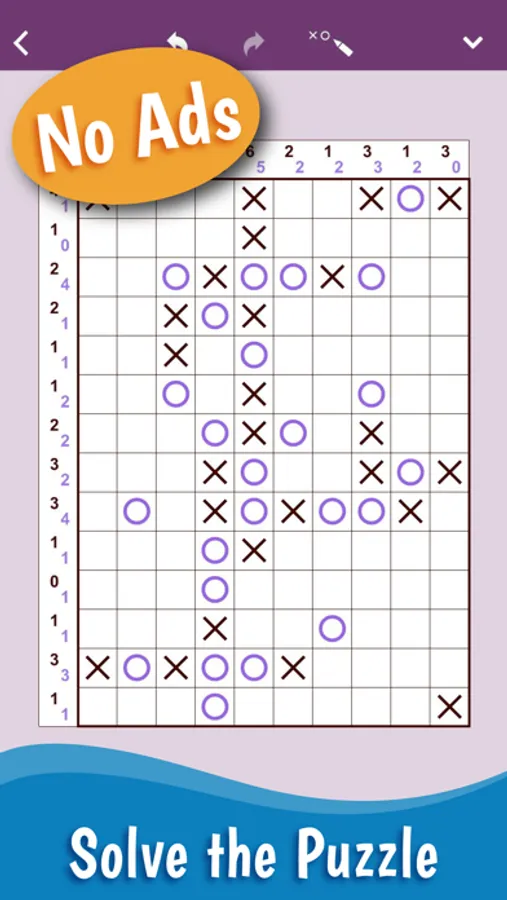 The game features a ruler to help viewing and comparing rows or columns, counters to show how many X and O there are in each row and column, and pencilmarks to place temporary X or O when solving very hard puzzles.
