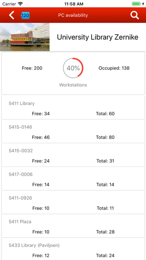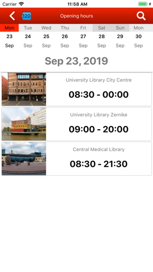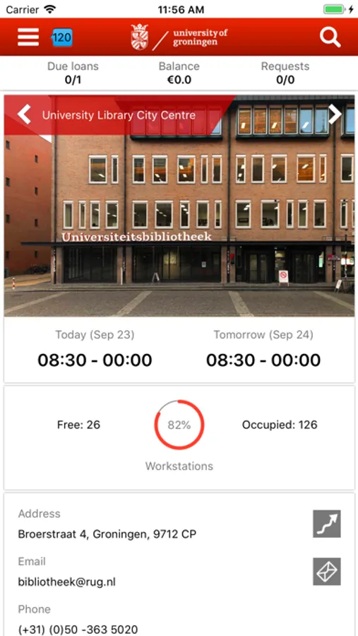 The University of Groningen Library app gives you easy access to important library information. Use the app to find opening hours and free workstations, search the catalogue and check and renew your loans.