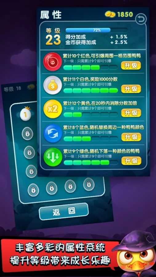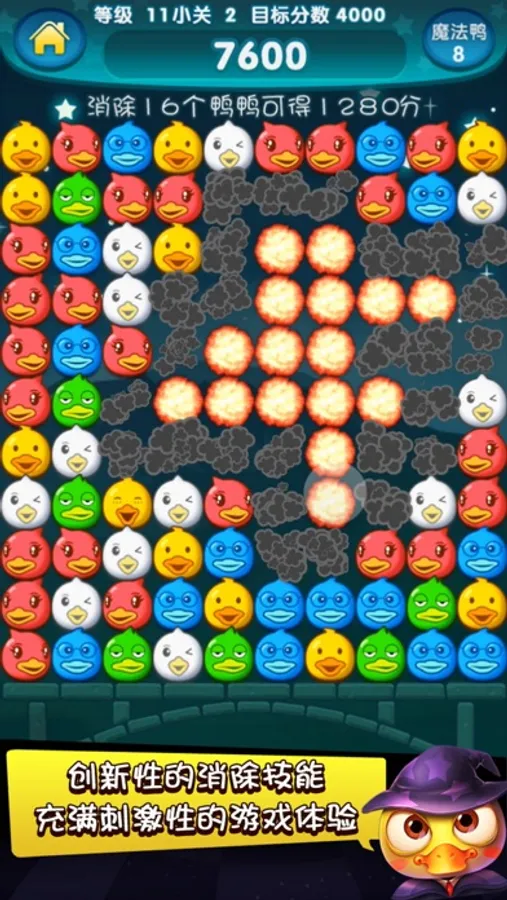 Magic Duck has a bomb, color, drop, double and additional grading five kinds of skills. Different level of skill, power is not the same oh.