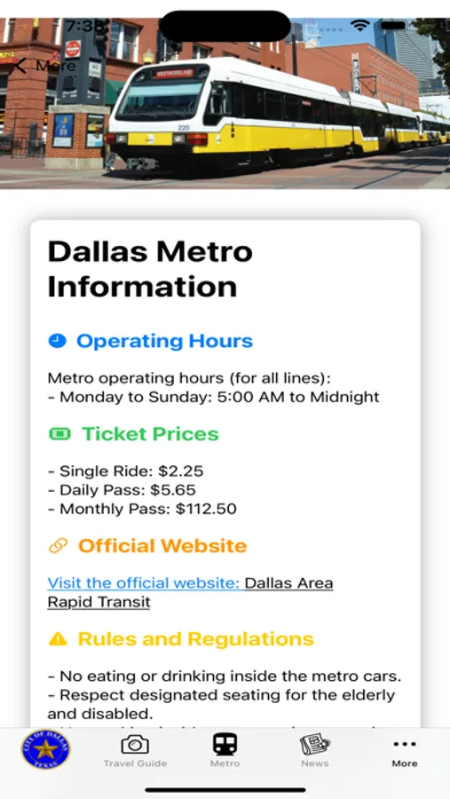 Detailed information about the Dallas metro system, including operating hours, ticket prices, rules, and regulations. Our app ensures you have all the necessary details at your fingertips for a comfortable and convenient travel experience.