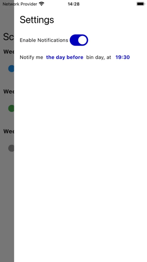 See a whole calendar of bin collections, and optionally receive notifications the day before, or the day of, your next bin collection