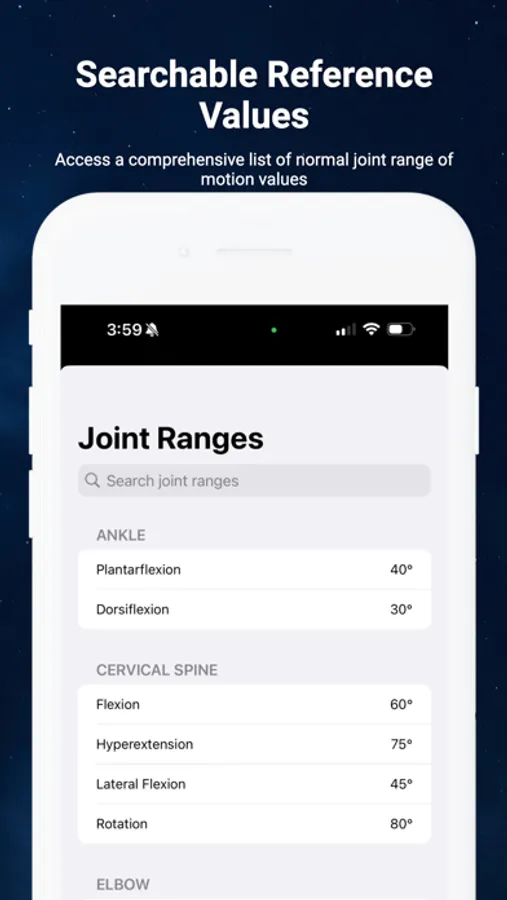 - Searchable Reference Values: Access a comprehensive list of normal joint range of motion values with a simple search function. Tap the magnifying glass icon to find the information you need quickly.
