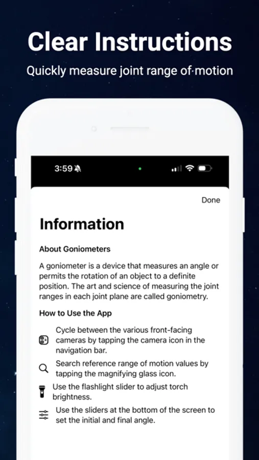 - Detailed Instructions and Info: Learn how to use the app effectively and understand the basics of goniometry. Tap the info icon to access a detailed guide and explanations.