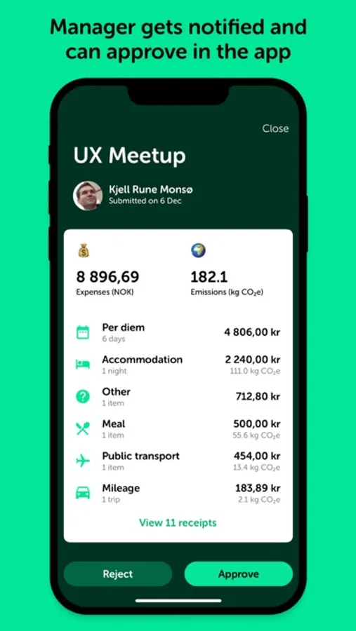 • Approve or reject expense reports directly from the mobile app or the admin web