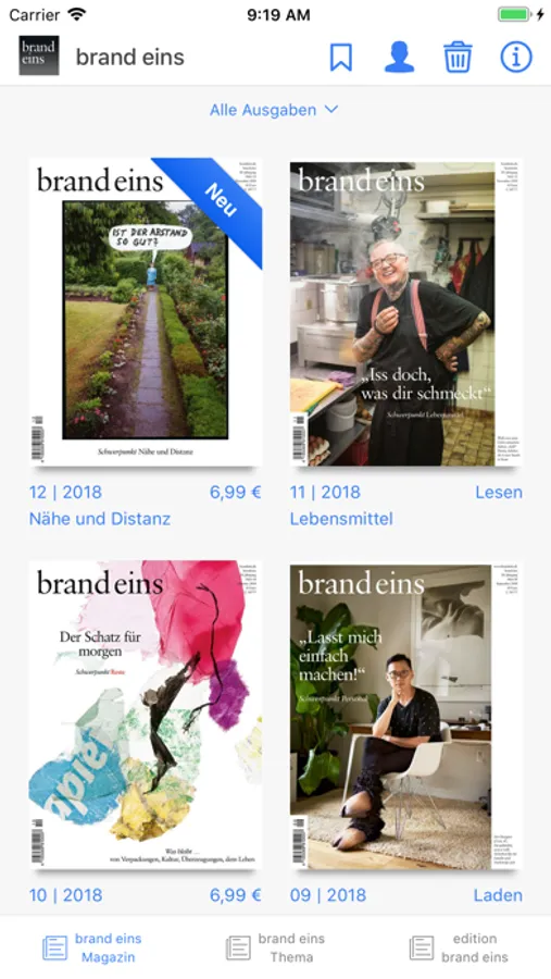 - Ausgabenübersicht: Markierung für neue, kostenlose und bereits heruntergeladene Ausgaben, Preisanzeige