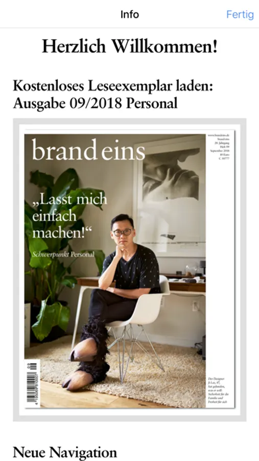 brand eins ist das Wirtschaftsmagazin, das nach Hintergründen und Zusammenhängen sucht, Mut zu Veränderung macht und zeigt, was geht. In unserer App ist die Ausgabe 07/2012 mit dem Schwerpunkt „Digitale Wirtschaft“ als kostenlose Leseprobe enthalten. Sollten Sie Probleme mit Funktionalitäten haben, kontaktieren Sie uns bitte per Mail (app@brandeins.de), damit wir Ihnen helfen und das Problem lösen können. Vielen Dank.