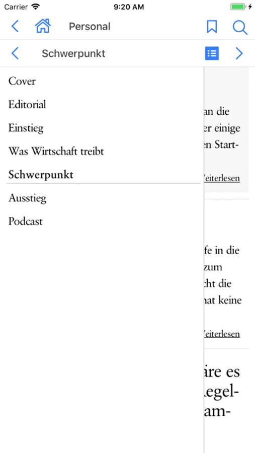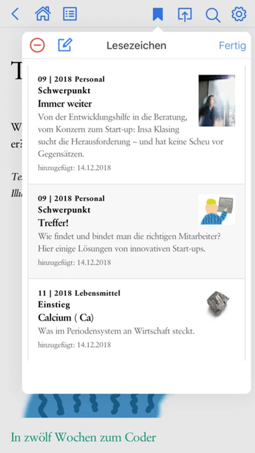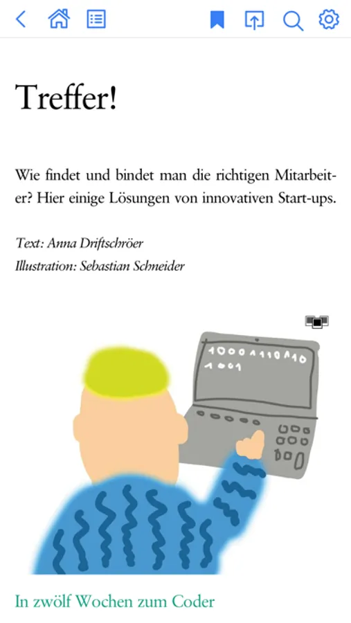 - Artikel merken: beim erneuten Öffnen einer Ausgabe oder der App wird der zuletzt gelesene Artikel aufgerufen