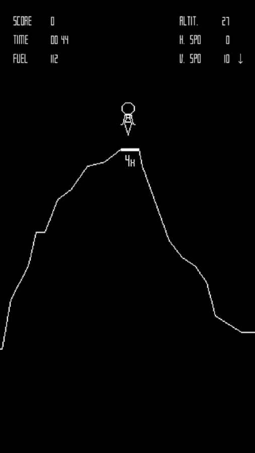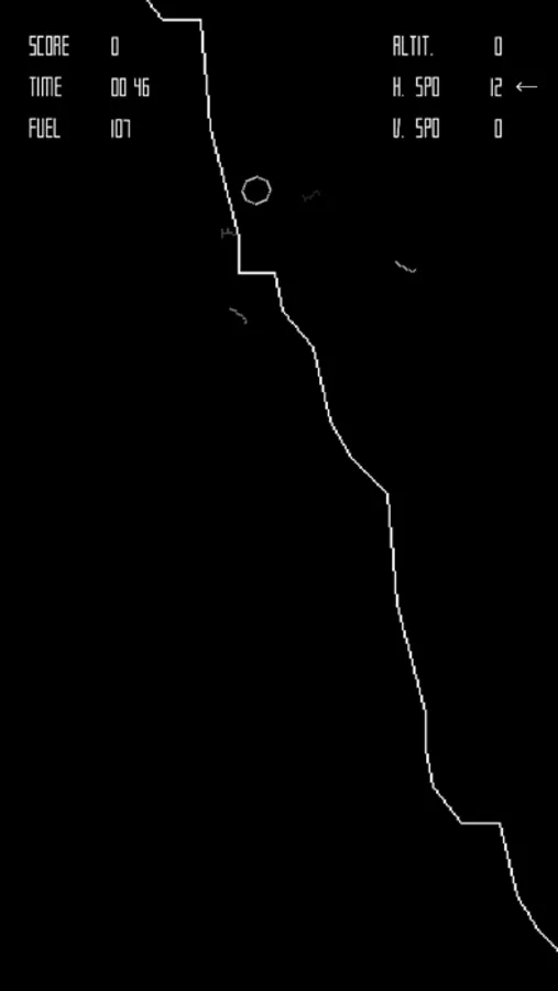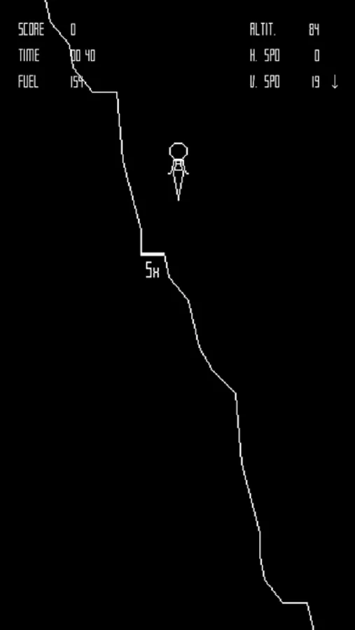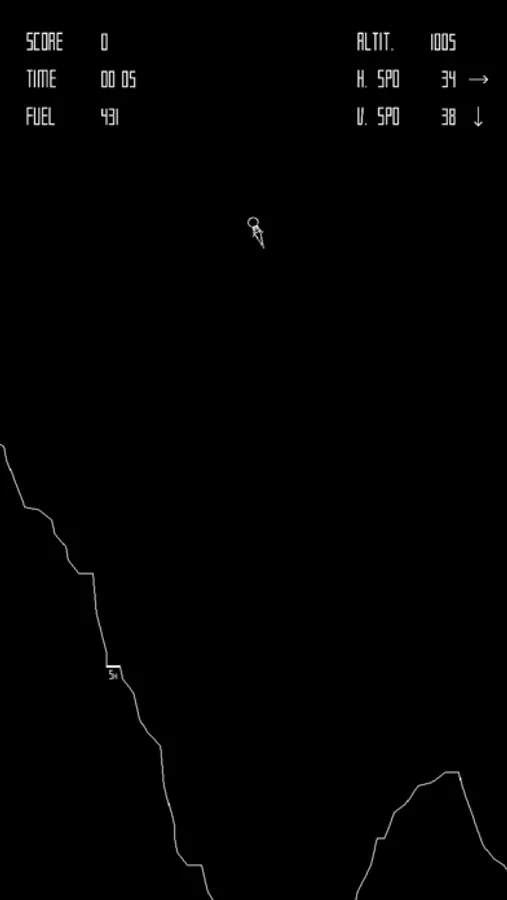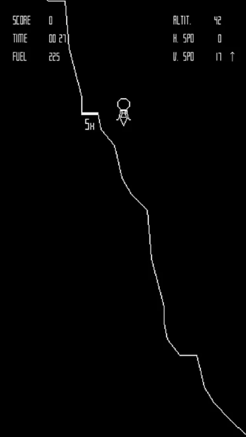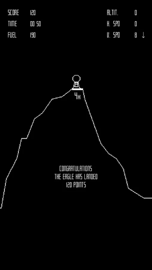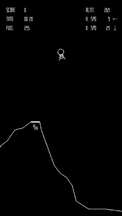 The player controls The Eagle a lunar landing module, viewed from the side, and attempts to land safely on the Moon.