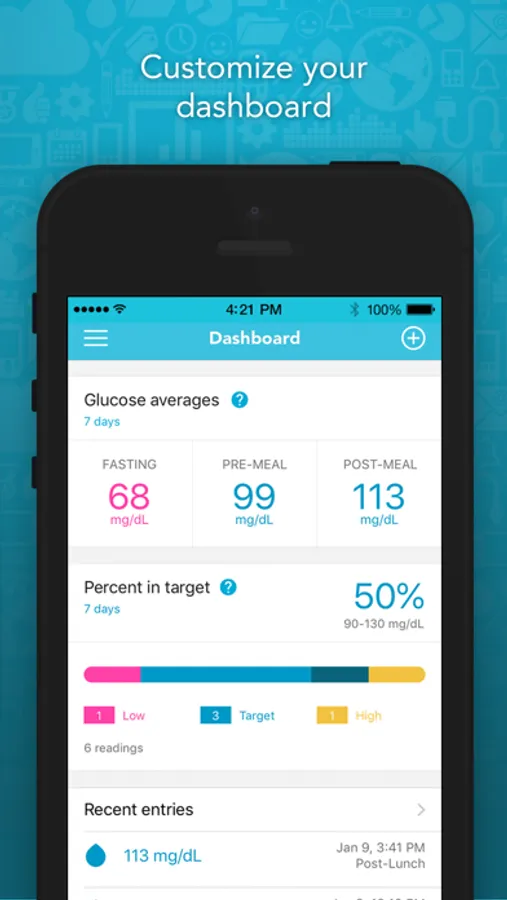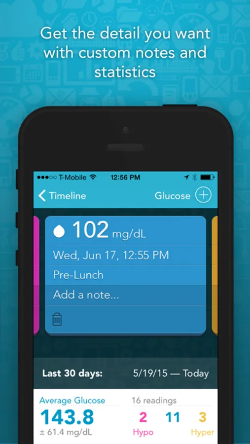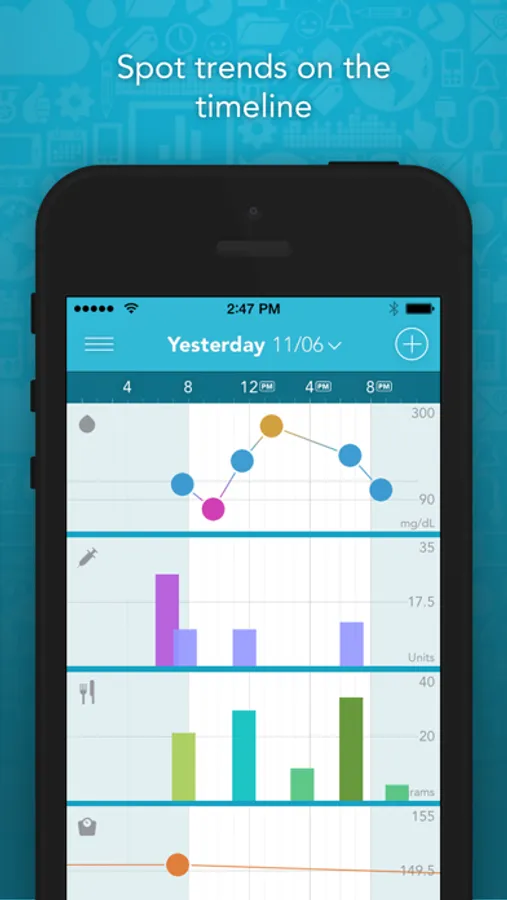 Record glucose, insulin, carbs and weight with a touch of a button.