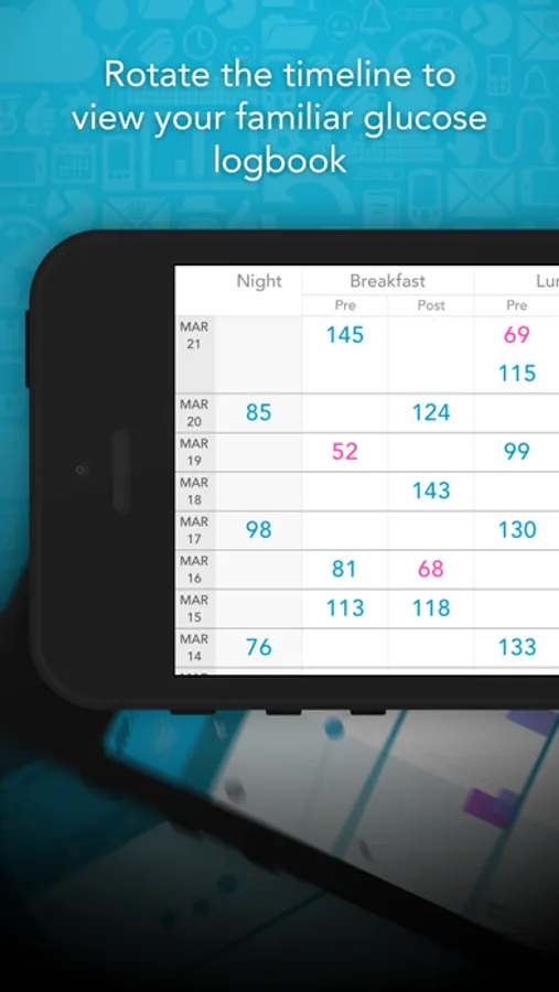 Rotate the app for the glucose logbook you know and love, organized by meal block.