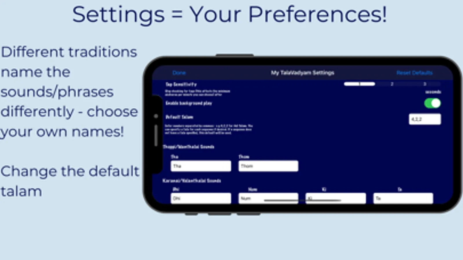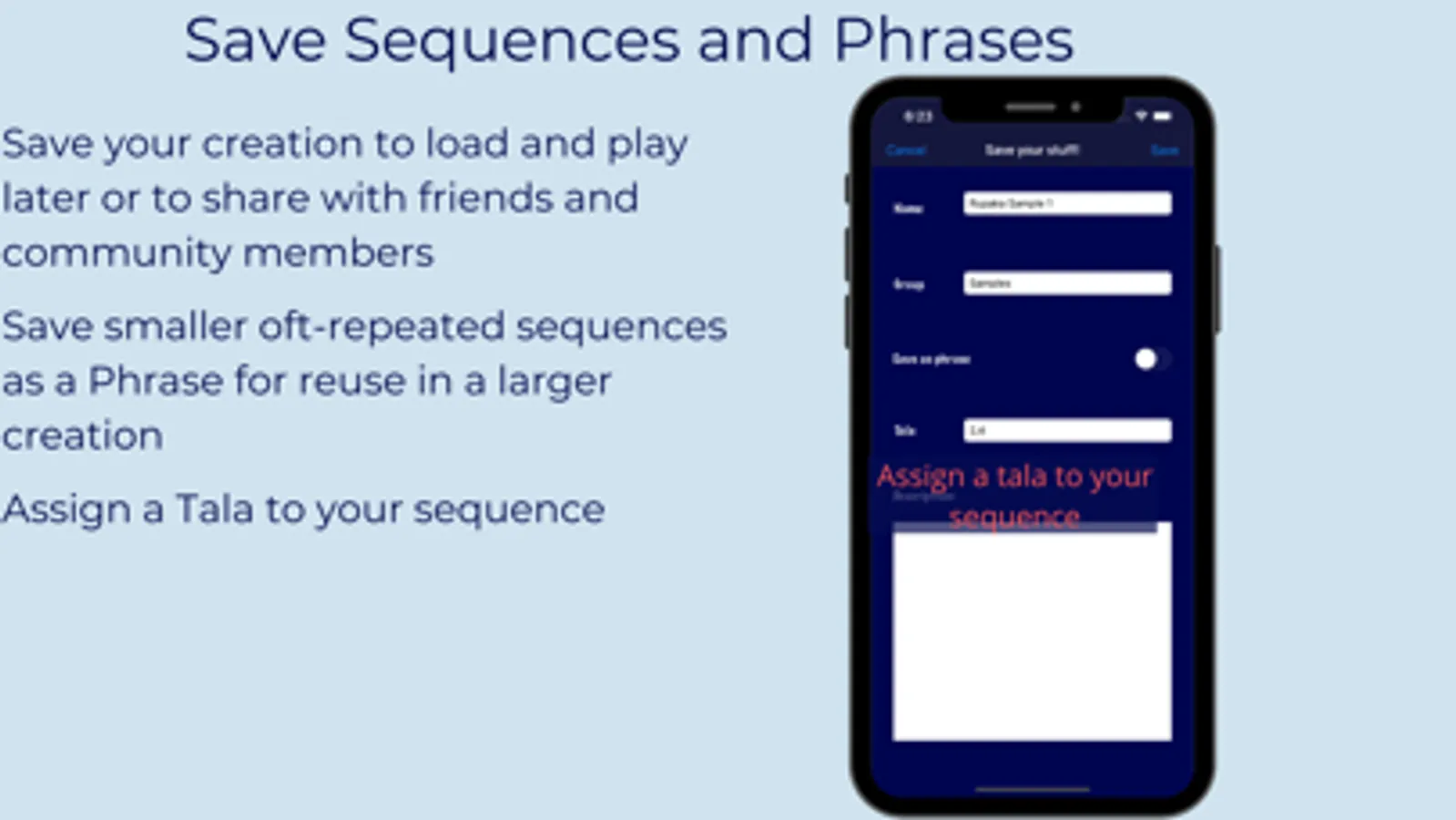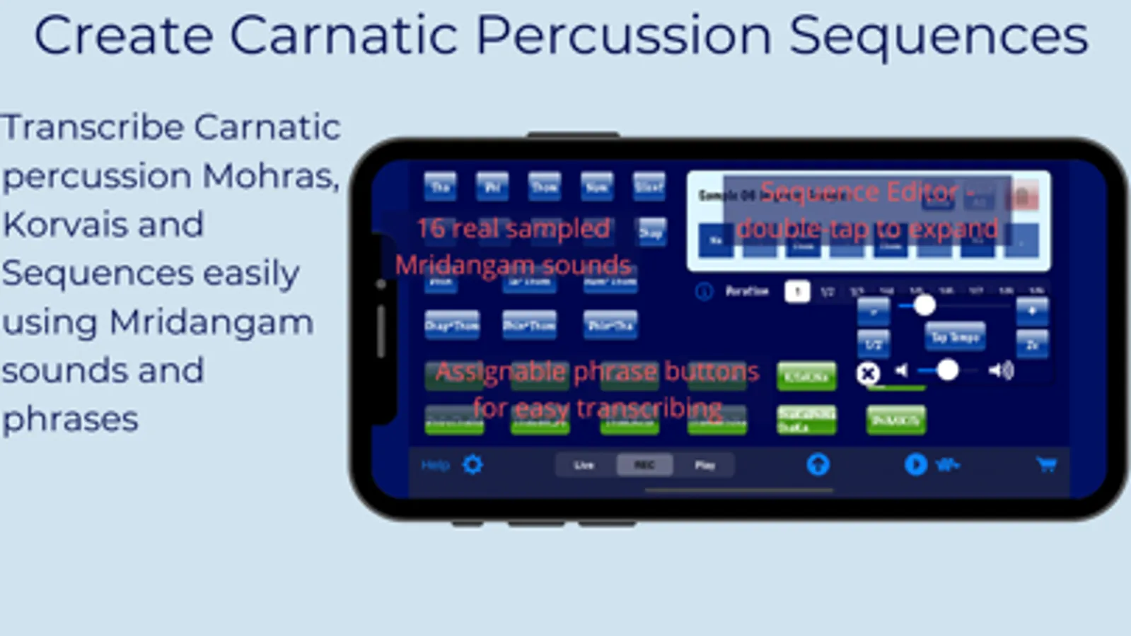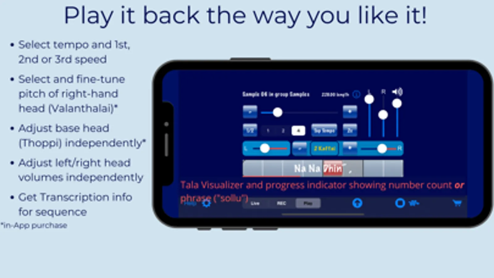 Create and playback Carnatic Percussion sequences with ease with My TalaVadyam! My TalaVadyam uses real, natural sounds of the Mridangam and offers a precise kala pramānam (tempo) for an unparalleled new musical experience!