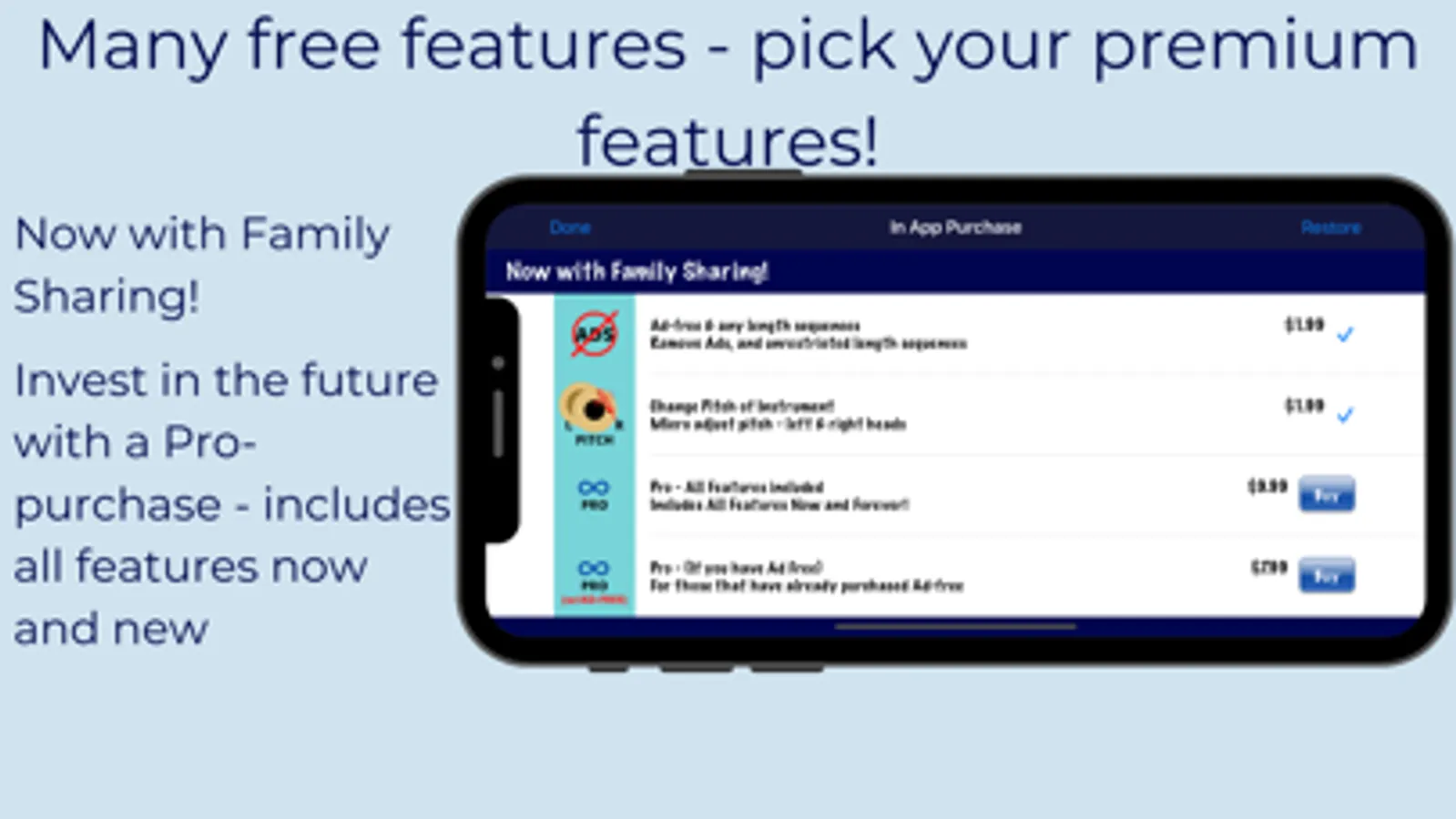 Enjoy ad-supported "My TalaVadyam" for free. If you like what you see, in-app purchases will get you additional features for a nominal fee. Or get the "Pro" in-app purchase - this one time purchase will get you all features, present and future! In-App purchases now feature Family Sharing!