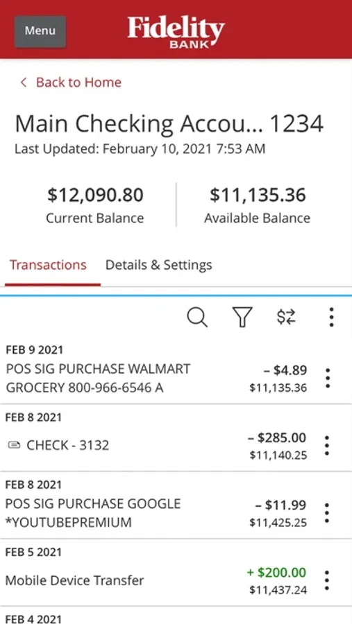 Account monitoring - Check your latest account balance and search recent transactions by date, amount, or check number.