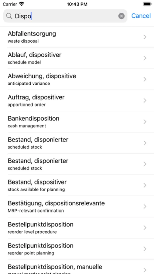 The search function works in both directions, i.e. you can enter in the search field either German or English terms and all corresponding entries will be displayed immediately.