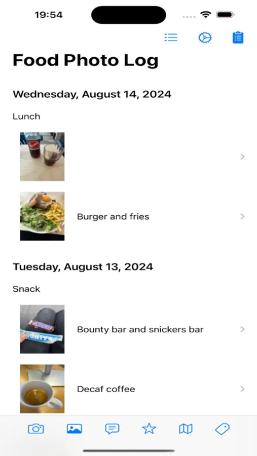 Log photos of what you eat, from your camera or photo gallery and optionally name and comment on the food.