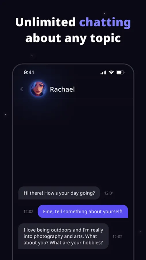 Also you don't have to worry about anyone finding out about your conversations with AI, because for us your privacy and security is our top priority. We provide a safe and secure space to express yourself with your AI companion.