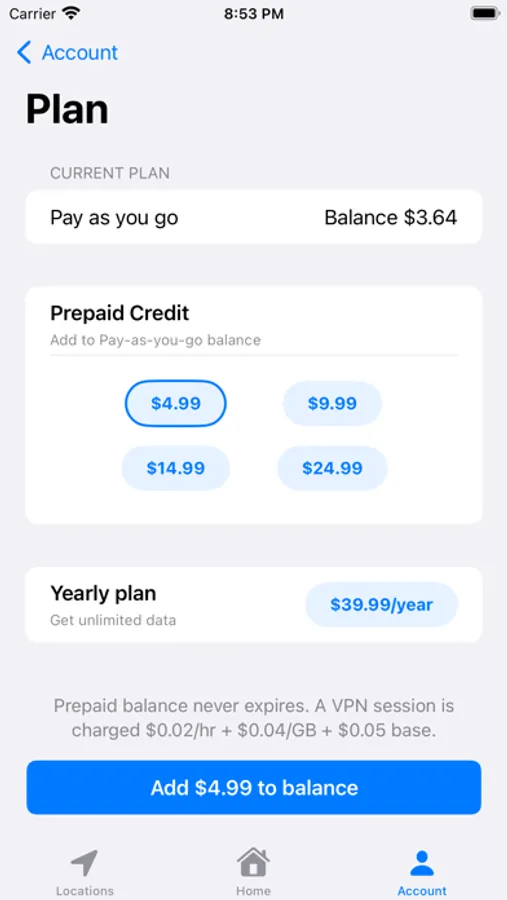 - Each VPN session is charged $0.02/hr + $0.04/GB + $0.05 base