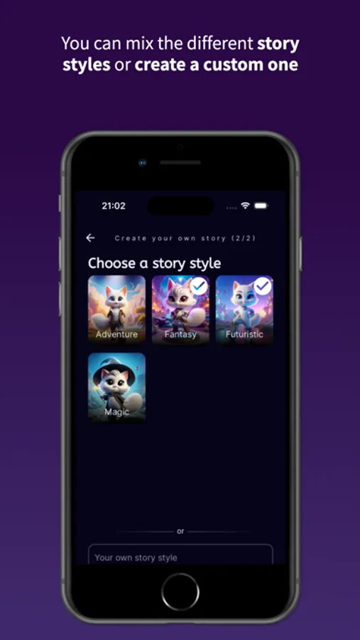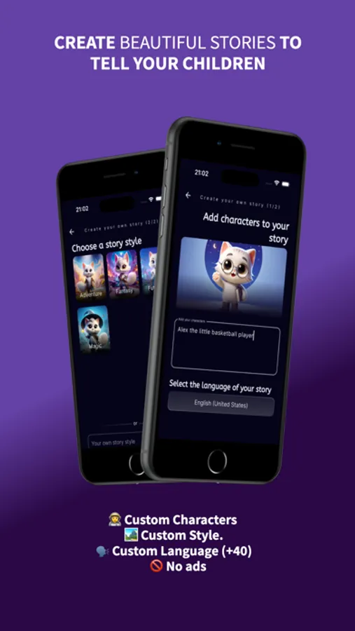 Bring your unique stories to life by choosing every detail and customizing them to your liking. Select characters and describe them however you want—from their appearance to their personality, you're in control! Also, choose the story style you prefer. The app offers classic options like adventures, fantasy, pirates, or magic, as well as unique styles like video games, the Olympic Games, the Roman Empire, vacations, or car races. You can select one or mix multiple styles for your story. Don’t see the style you want? You can also create your own! Creativity knows no limits!