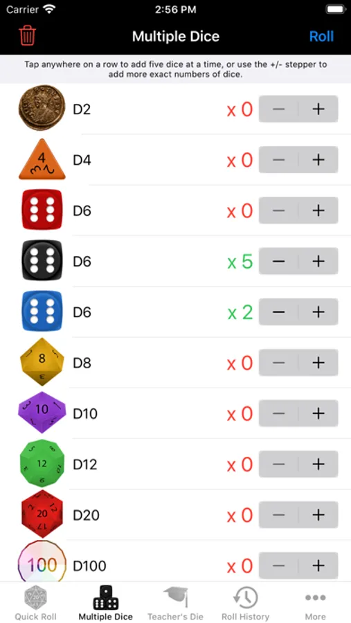 In multiple dice mode you can mix your dice together as you please. Tap each row to add five at a time, or use the plus or minus to add or remove one. You can roll or remove individual dice again. Stats, such as average and the sum, are displayed for each roll saving you counting on screen.