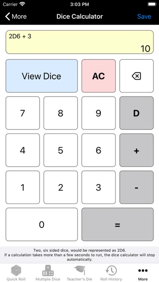 My Dice allows you to save your own collections of dice, along with a description and optional modifier. These can be easily searched through, and rolled from a single tap.
