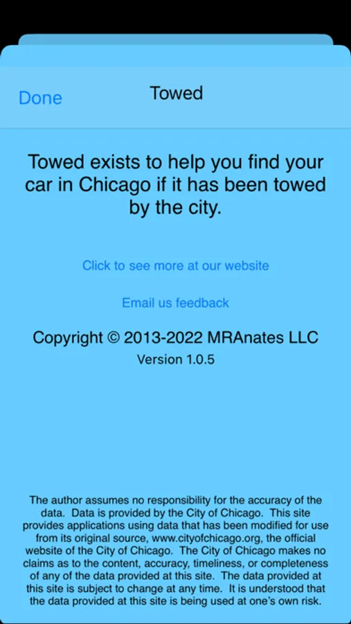Towed lets you find your car if it has been towed in Chicago, Illinois, by the local government. It lets you search by license plate, and provides directions to the facility to which your car was towed. It also allows you to call the facility directly. If you car is not found via the app, it directs you to various web sites for assistance.
