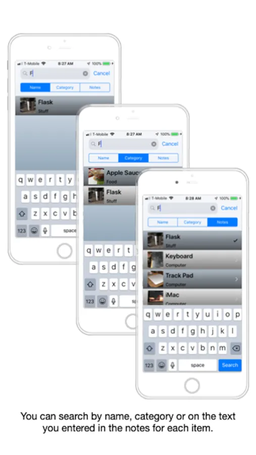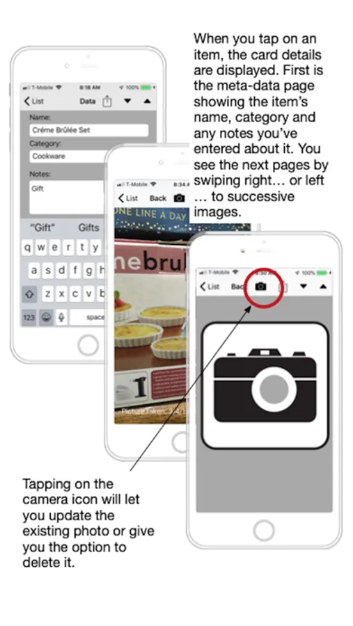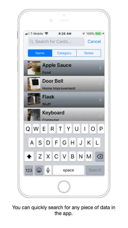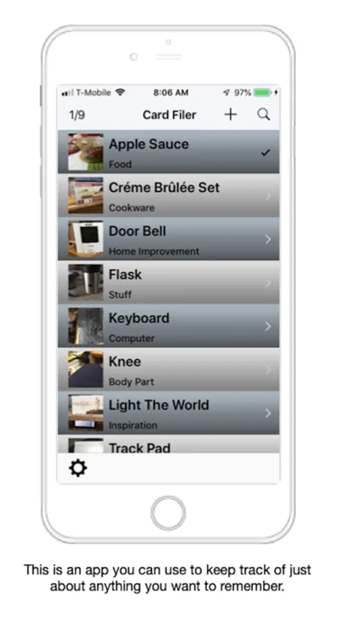 To enter an item just press the +, take 1 or 2 pictures, give the item a name and a category, and enter any notes you would like. This can be the location, the price, when acquired, whatever; it’s up to you. Then hit List and your item is recorded. When you are ready to find that tool or you are at the store and want to know if you already have that set of knitting needles, or that book, simply go to CardFiler on your iPhone or iPad. You can search by name or category or simply have CardFiler display all items alphabetically by name or category, just in case you can’t remember what you called something. All items are displayed with a thumbnail in front for immediate identification. Just touch the desired item and the full record opens up where you can see your notes and swipe right to see your pictures. You can also tap the thumbnail and see a larger version of the photo right from the list.