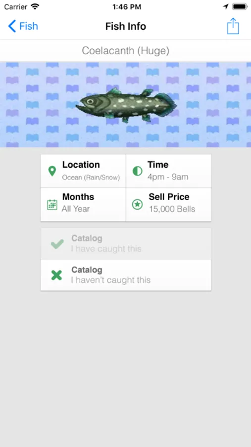 - Find the fish, bugs & diving creatures that can be caught in each month (check off which you've already caught straight from the list, just by tapping the icon to the right of it).