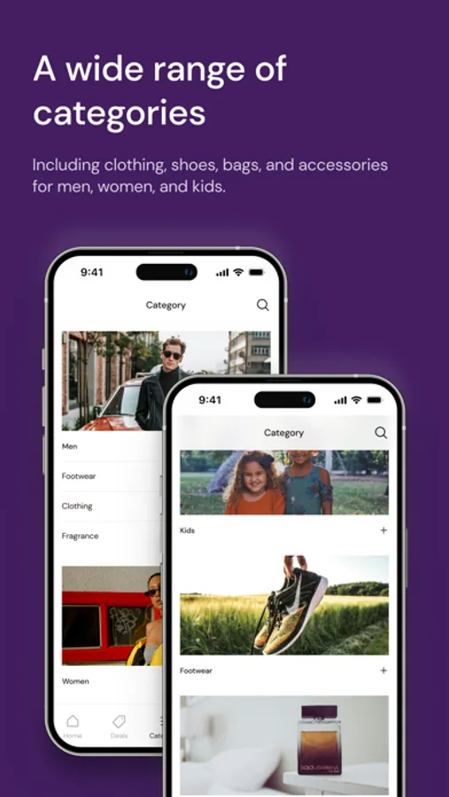 • A wide range of categories including clothing, shoes, bags, and accessories for men, women, and kids