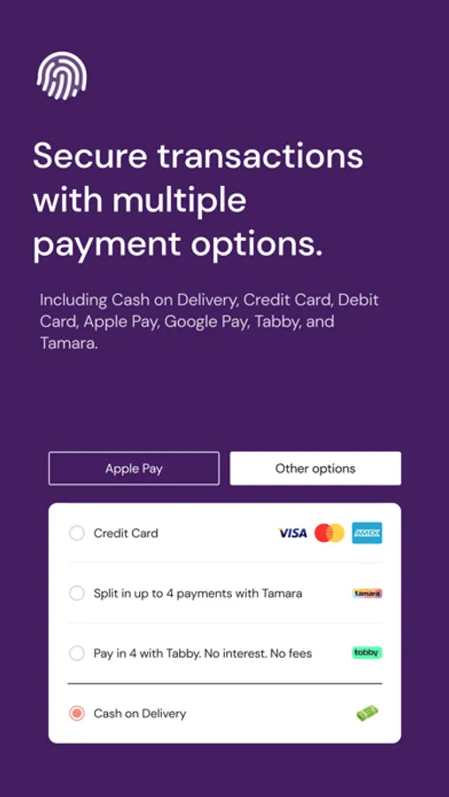 • Secure transactions with multiple payment options including Cash on Delivery, Credit Card, Debit Card, Apple Pay, Google Pay, Tabby, and Tamara