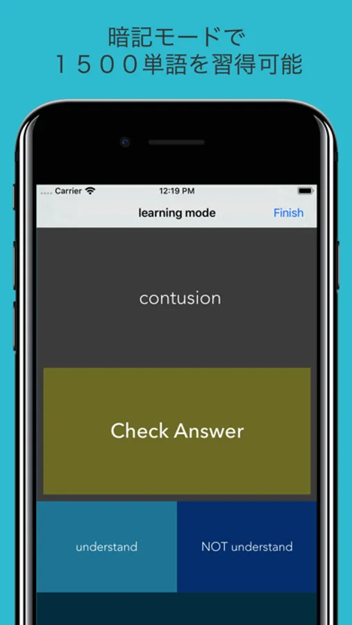 ここでの目的は単語を暗記することです。表示された単語を知っていれば◯、知らなければ×を選択してください。単純な作業ですが、暗記カードのようにまずは知っている単語と知らない単語に分けることで、自身の語彙の蓄積と進展具合を確認することができます。単語と一緒に音声も流れるので、同時に発音やアクセントもチェック可能です。