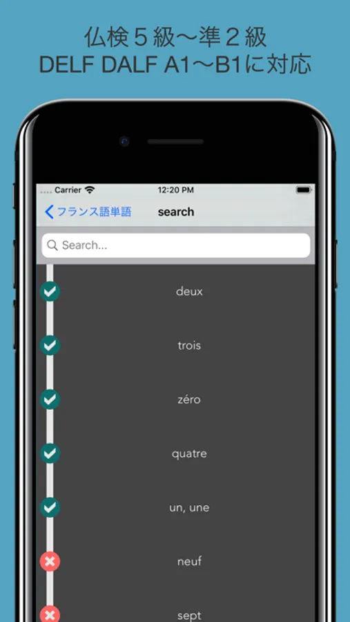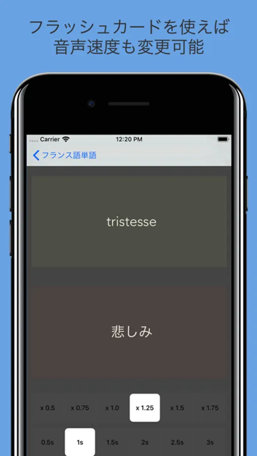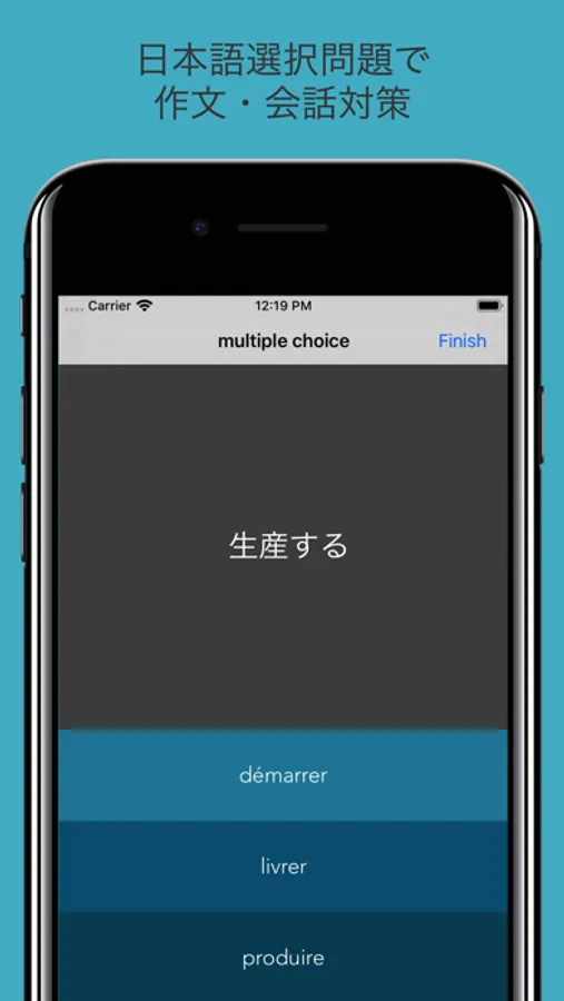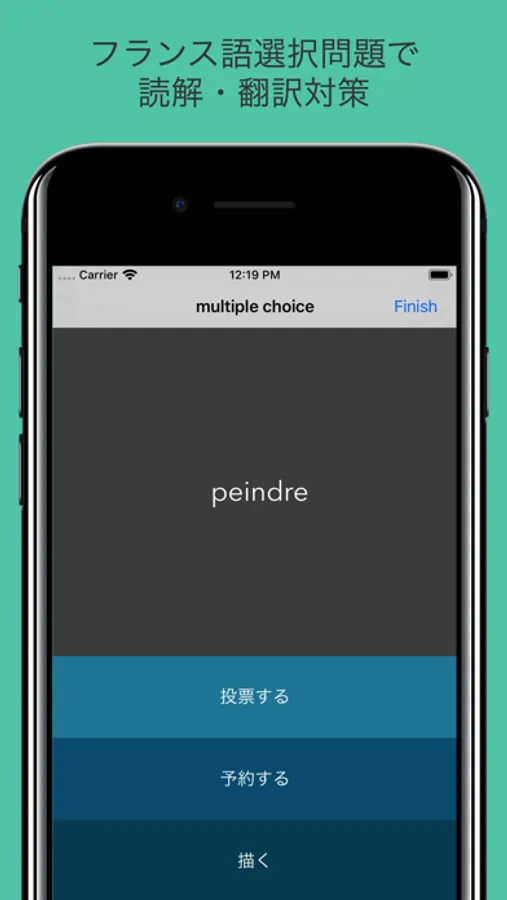 ここでは単語を聞き取るトレーニングをします。スピーカー(イヤホン)から流れてくるフランス語単語に見合う日本語を選択します。分からない場合はスピーカーのアイコンをタップすることで再度音声が流れます。それでも分からない場合は「表示」ボタンをタップすることでスペルが表示されます。結果は成績部分に保存され、あとから間違えた問題のみを学習することもできます。