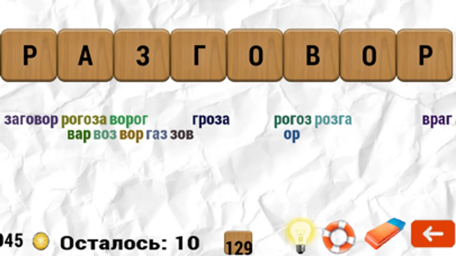 На данный момент в игре доступно 10 слов, из которых можно составить несколько сотен слов меньшего размера.