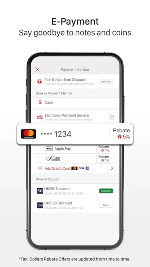* Now supporting Electronic Payment Service. You call a taxi and pay the fare all within HKTaxi. Now enjoy the most comfortable taxi ride ever.