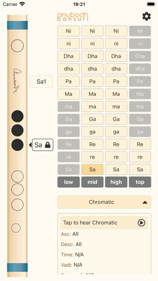 This app is a tool designed to help figure out easy finger positions for various Ragas or musical scales on bansuri bamboo flute, which may be difficult to finger with the standard Sa (tonic note) position at first three holes closed.