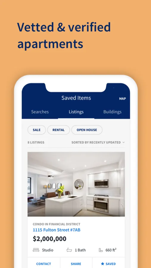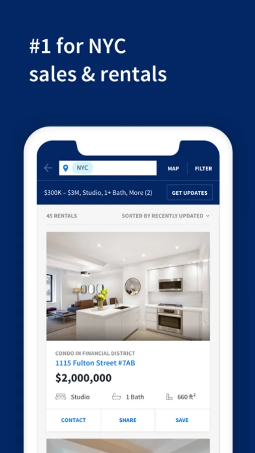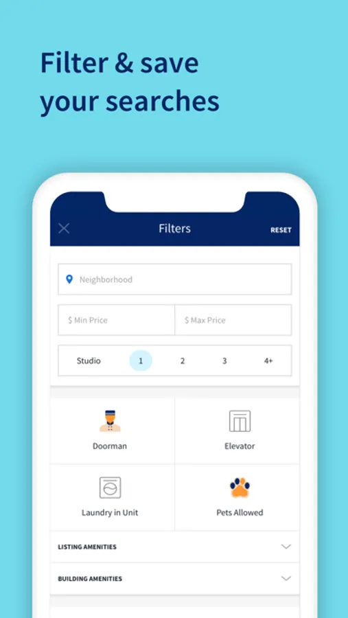 - Sort and filter by price, neighborhood, buildings, virtual tours, and amenities like doorman, elevator, pets, washer/dryer and more