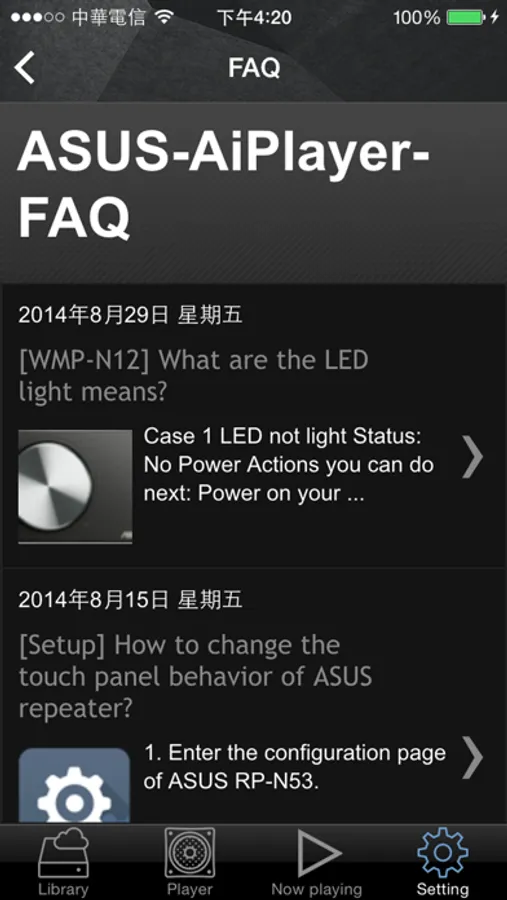 ASUS AiPlayer is an app that allows you to stream music saved on mobile devices or USB storage paired with ASUS enhanced media routers*, then play it through speakers connected to the RP-N53, RP-N14, RP-AC52, RP-AC56, WMP-N12 or some 3rd party compatible devices.