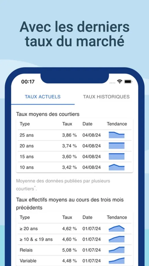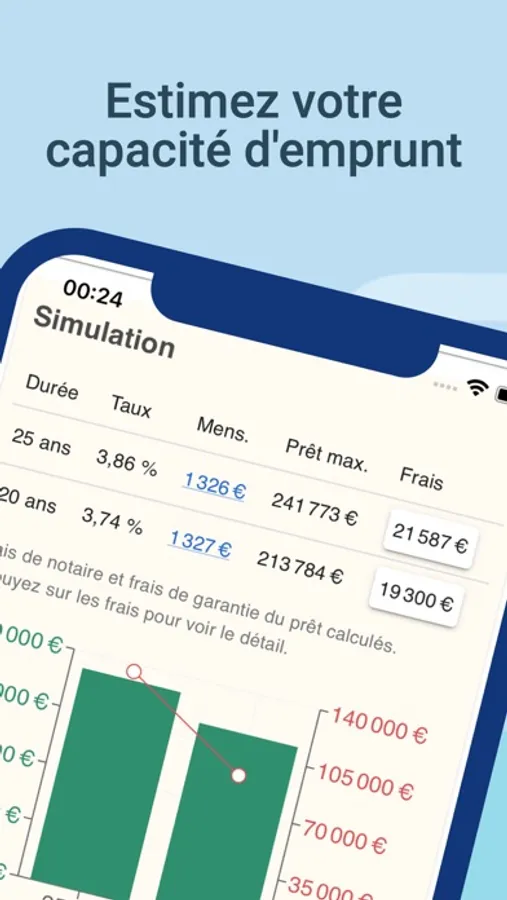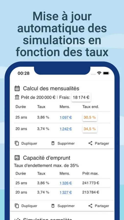 * Plusieurs types de simulation avec les derniers taux du marché: estimation de la capacité d'emprunt, rachat de prêt, etc.