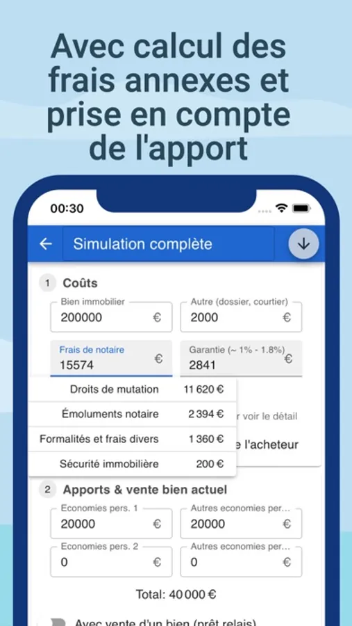 Application permettant de simuler un prêt immobilier, avec calcul des frais annexes: frais de notaire, frais de garantie de prêt, ainsi que de voir les ventes passées DVF.