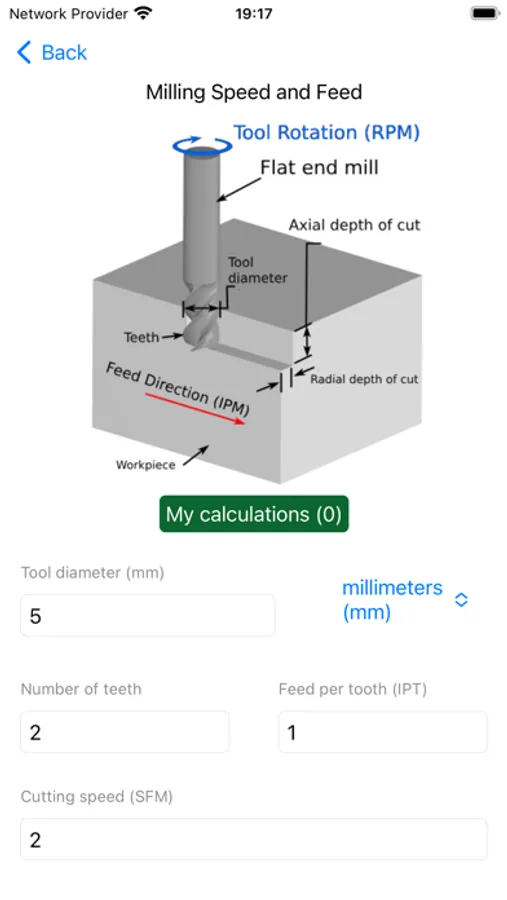 • Smart defaults — choose tool material and workpiece alloy to pre‑fill recommended SFM and fz.