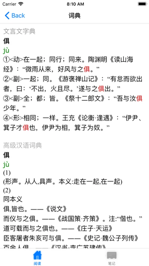4、内置词典。内置文言文字典和高级汉语词典,阅读时遇到难懂的字、词无需联网一查即知。