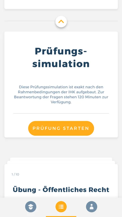 Mit Hilfe der realistischen Prüfungssimulation haben Sie die Möglichkeit, Ihr im Lernbereich zuvor erworbenes Wissen zu testen. Die Rahmenbedingungen entsprechen den allgemeingültigen Vorgaben der IHK in Bezug auf die Zeitvorgaben, Antwortmöglichkeiten, Fragenanzahl usw. Nach einem Testdurchlauf wird in der Statistik ein Bestehen oder Nichtbestehen sofort dargestellt. Zudem kann eine detaillierte Auswertung erfolgen, bei der jede einzelne Frage auf „Richtigkeit“ nachvollzogen werden kann.